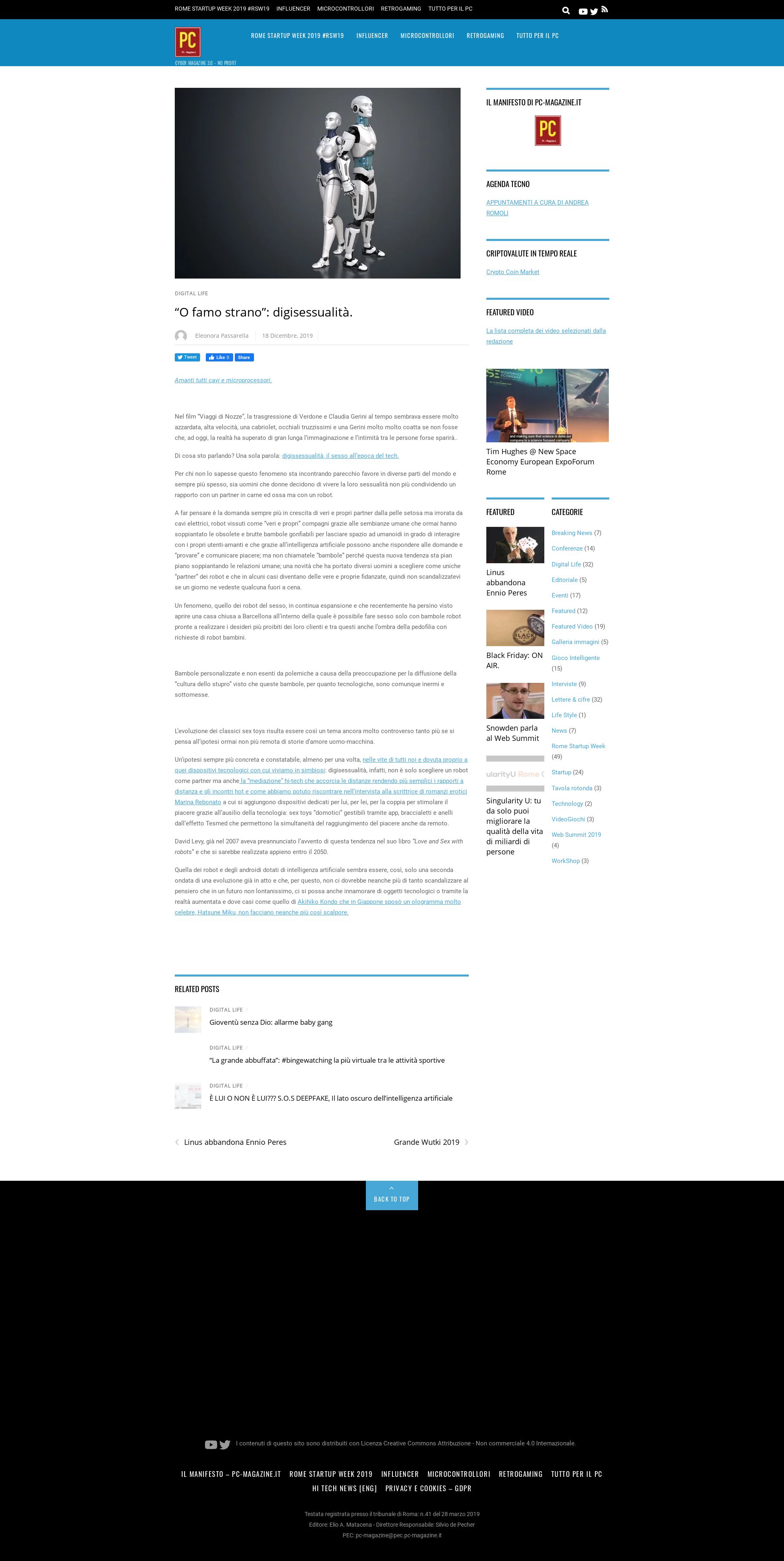 18/12/2019 AUTORE WEB REPORTER PASSARELLA ELEONORA: AMANTI TUTTI CAVI E MICROPROCESSORI MA LA REALTÀ È RIUSCITA A SUPERARE L'IMMAGINAZIONE E L'INTIMITÀ TRA LE PERSONE FORSE SPARIRÀ: L'AMORE AL TEMPO DEL TECH DIVENTA DIGISESSUALITÀ |